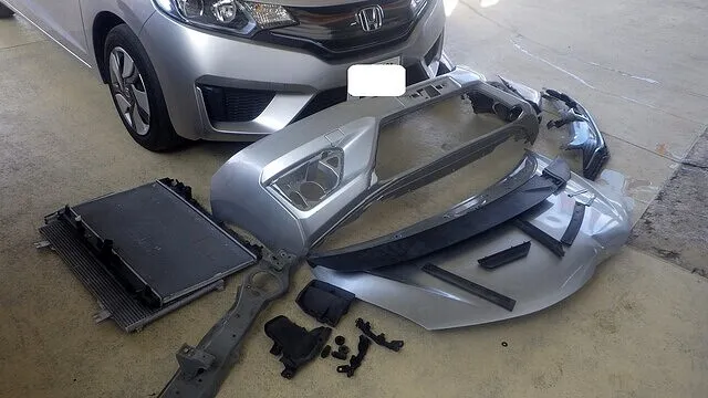 泉佐野市 ホンダ フィット フロントバンパー 左右ヘッドライト ボンネット ラジエター コンデンサー 交換修理 左右フェンダー 板金塗装修理 カーサービスシンワ カーサービス シンワ