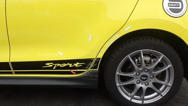 泉佐野市 スズキ スイフトスポーツ 左後ろ キズヘコミ 鈑金塗装修理 泉佐野市のお客様 早くて丁寧 カーサービスシンワ カーサービス シンワ