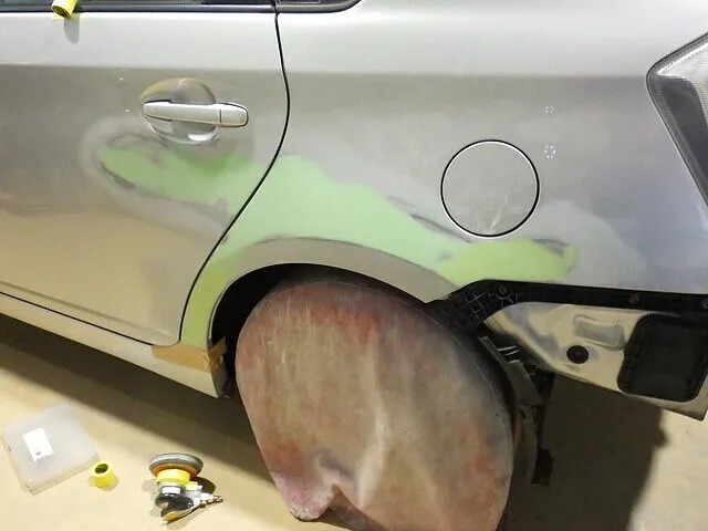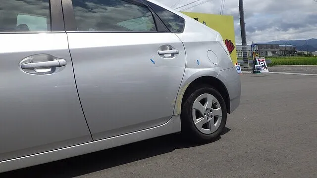 泉佐野市 トヨタ プリウス リアドア 左クオーターパネル ヘコミキズ修理 いず カーサービス シンワ