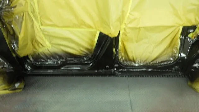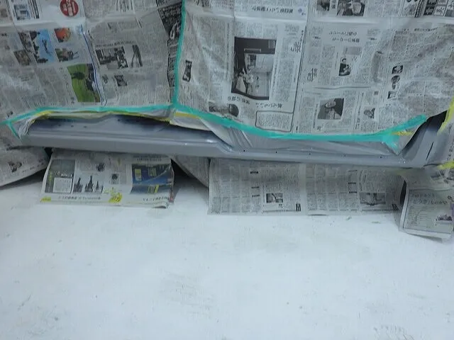 サフェーサーを研磨してペイント部分以外のボディをマスキングと言って養生紙で隠します。