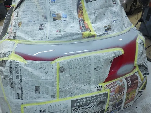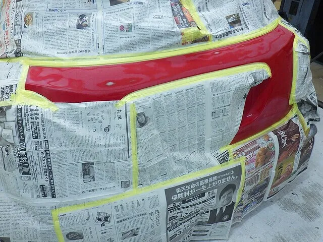 サフェーサーを研磨してペイント部分以外のボディをマスキングと言って養生紙で隠します。