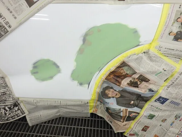 作業内容といたしましては凹み部分の塗膜をはがして溶接できるようにします。