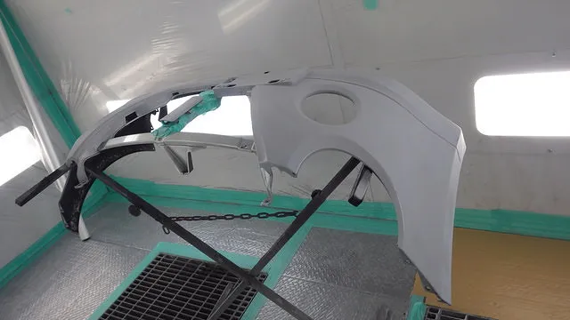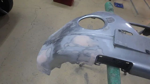 研磨します。フロントフェンダーも同様の作業をして錆止め効果のあるサフェーサーを