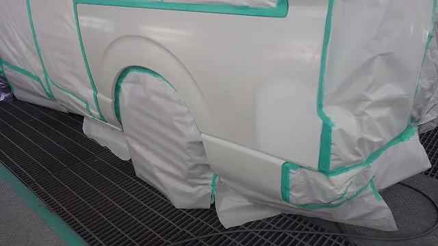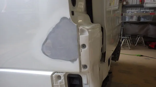 バンパーやテールランプがついたままだときずがつく可能性がありますのできっちり脱着して作業にかかります。へこみをハンマリング作業で平らにしていきます。そしてさらに平らにするために粘土状のパテをつけて研磨して平らにします。