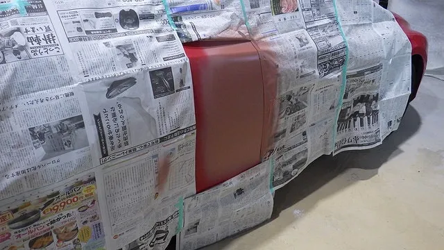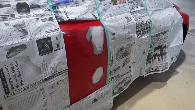 サフェーサーを研磨してペイント部分以外のボディをマスキングと言って養生紙で隠します。