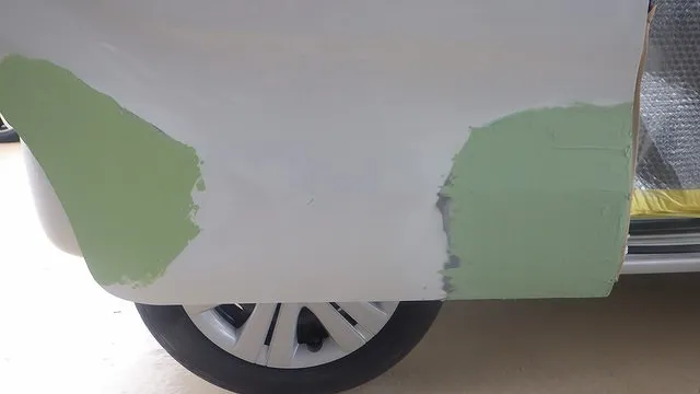 日産マーチのフロントバンパー穴埋めと天井の再塗装 泉佐野市
