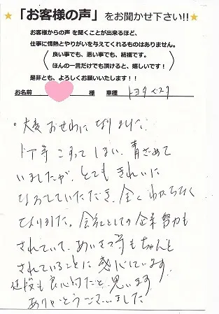 ドア等こすってしまい、青ざまていましたが、とてもきれいになおしていただき、全くわからなくなりました。会社としての企業努力もされていて、あいさつ等もちゃんとされていることに感心しています。値段も良心的だと思います。ありがとうございました。