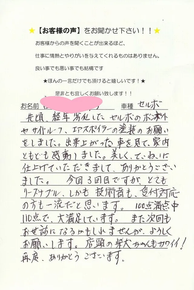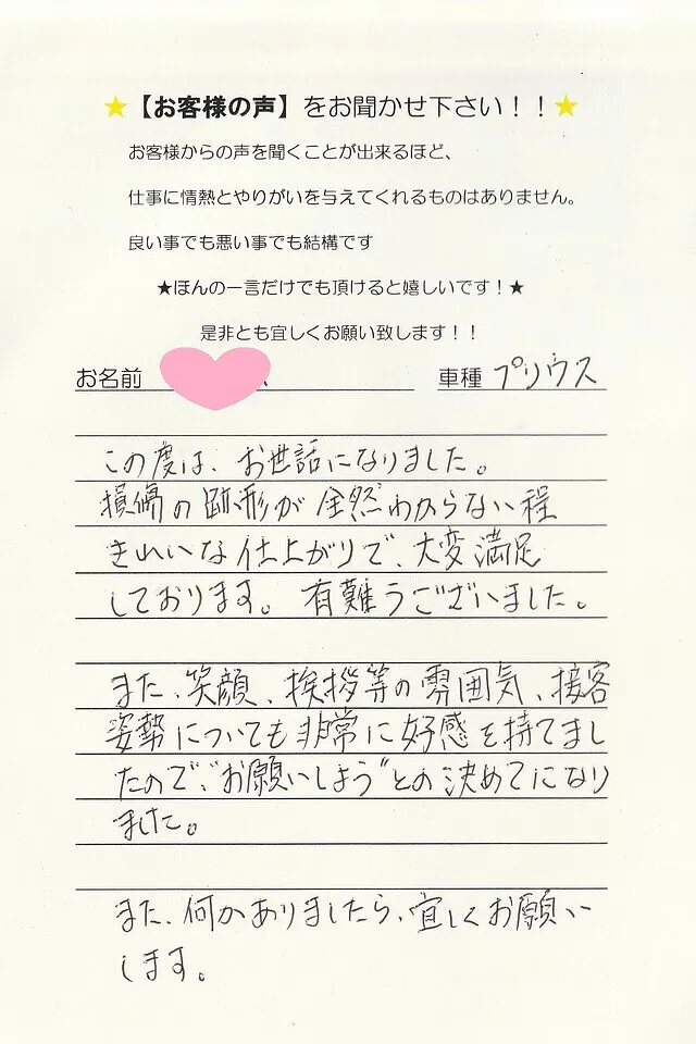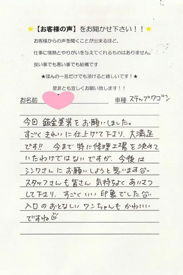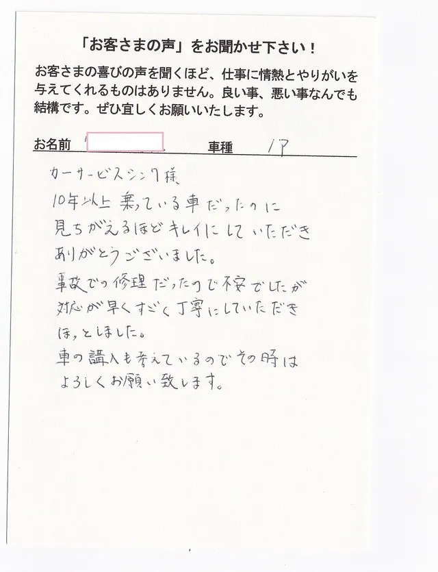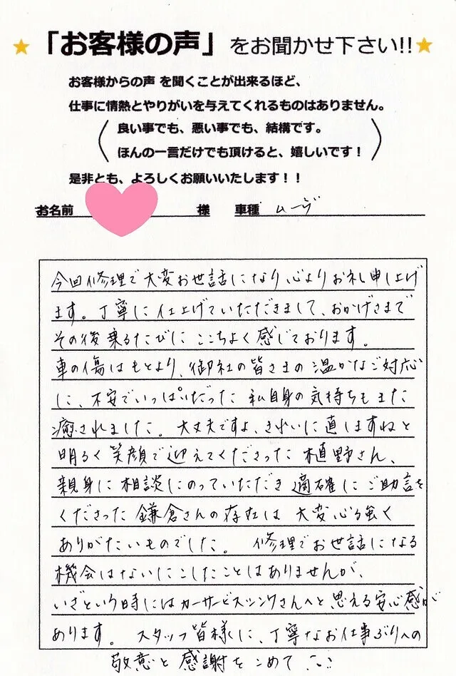今回修理で大変お世話になり心よりお礼申し上げます。丁寧に仕上げていただきまして、おかげさまでその後乗るたびにここちよく感じております。車の傷はもとより、御社の皆さまの温かなご対応に、不安でいっぱいだった私自身の気持ちもまた癒されました。大丈夫ですよ、きれいに直しますねと明るく笑顔で迎えてくださった植野さん、親身に相談に乗っていただき適確にご助言をくださった鎌倉さんの存在は大変心強くありがたいものでした。修理でお世話になる機会はないにこしたことはありませんが、いざという時にはカーサービスシンワさんへと思える安心感があります。スタッフの皆様に、丁寧なお仕事ぶりへの敬意と感謝をこめて(⌒∇⌒)