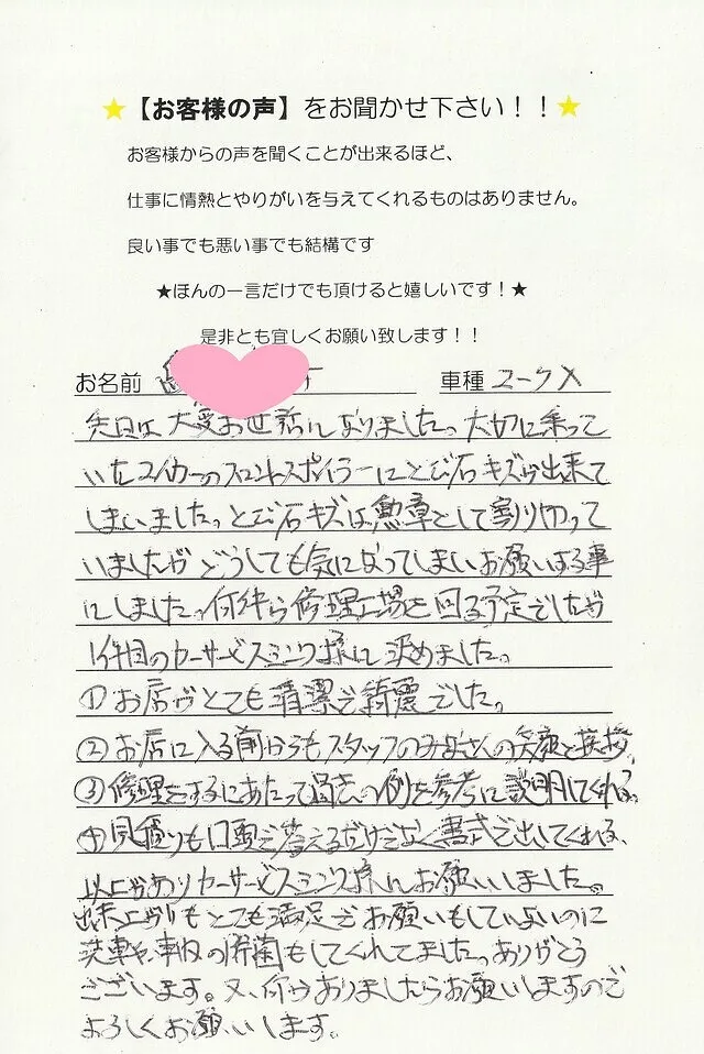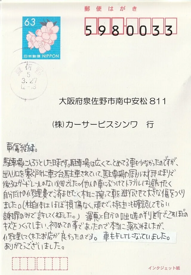 泉佐野市 お客様の声 カーサービス シンワ