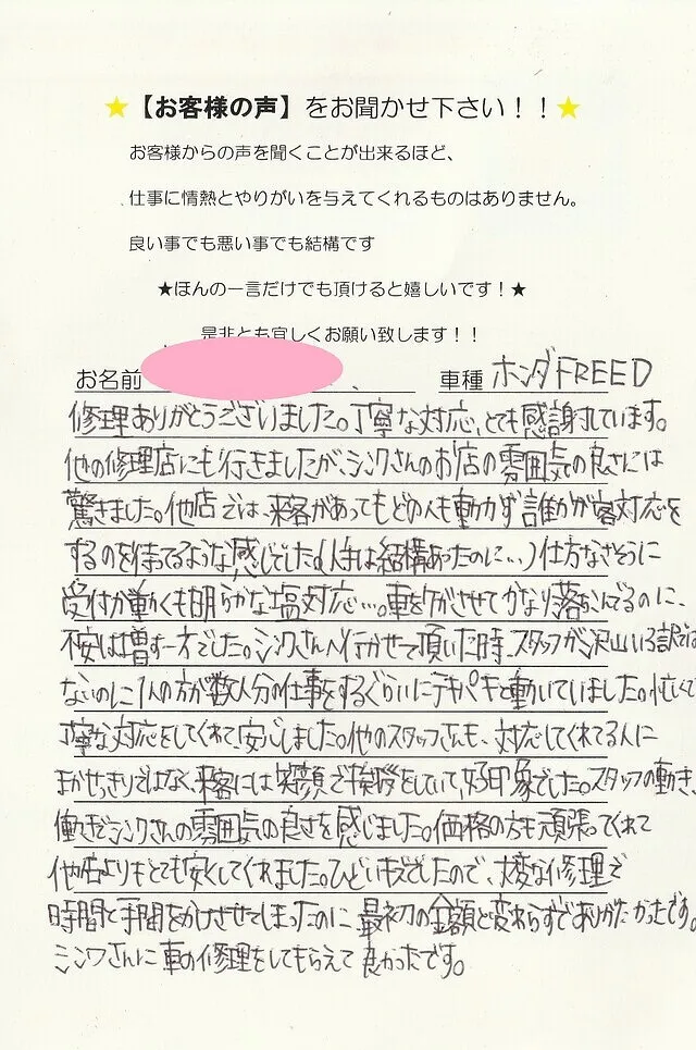 ホンダ フリード 修理していただいたお客様より 泉佐野市