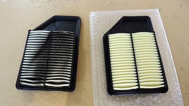 交換前(左)がかなり汚れていたのが一目瞭然です。汚れがたまると燃費が悪化する場合がありエンジン内部に汚れが入るとエンジン不調にもなる恐れがありましたので交換させて頂きました。