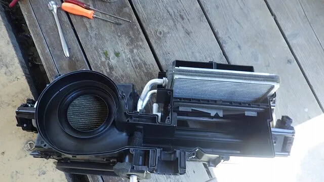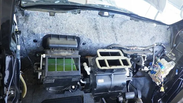 ダッシュボードが外し終わるとヒーターユニットが丸見えになりますので最後にヒーターユニットを室内から取り出していきます。