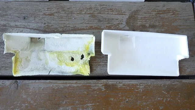 漏れて黒くなった部分とエアコンガスが漏れて黄色く色づいた下部カバーでエアコンをつけた時に独特な匂いがしてくるのはこれが原因かと思いますので下部カバーも交換していきます。