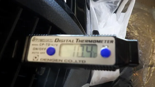 ガス注入後、エアコンのテストを行い、吹き出し温度が10.4℃まで下がっていました。